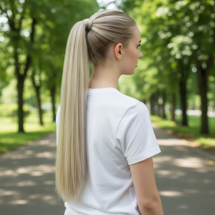 Bağlamalı Düz At Kuyruğu - Açık PlatinFiber sentetiktir.70-75 cm uzunluğunda, 140-150 Gr.civarındadır.Gerçek görünüme yakındır parlama yapmaz.Saça pratik bir yöntemle takılır.Saçınızı topladıktan sonra, at kuyruğunun cırt cırtlı bağlama kısmını saçın etrafından çevirin ve saçınızı kapatın.Ilık fön ve maşa uygulayabilirsiniz.130 - 140 dereceyi geçme..
