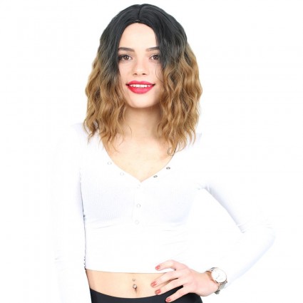 Fiber Sentetik Kısa Dalgalı Perçemsiz Peruk - Siyah / Karamel Ombreli