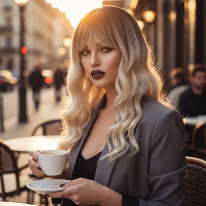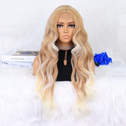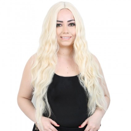 Doğal Dalgalı Perçemli Fiber Sentetik Uzun Boy Peruk - Koyu Kumral / Açık Rus Kumralı Ombre ve Röfleli