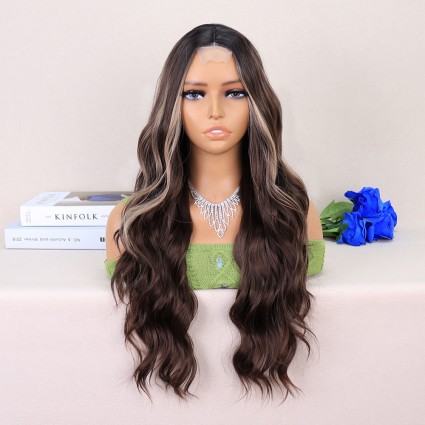Fiber Sentetik Uzun Su Dalgası Peruk - Kahve / Platin Ombreli