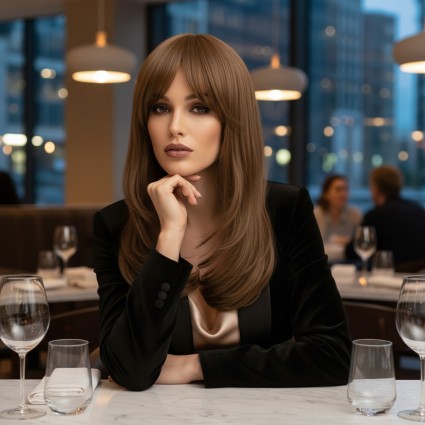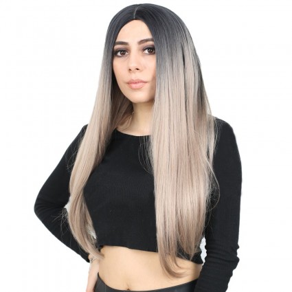 Yoğun Dalgalı Fiber Sentetik Uzun Perçemsiz Peruk - Siyah / Küllü Bebek Sarı Ombreli